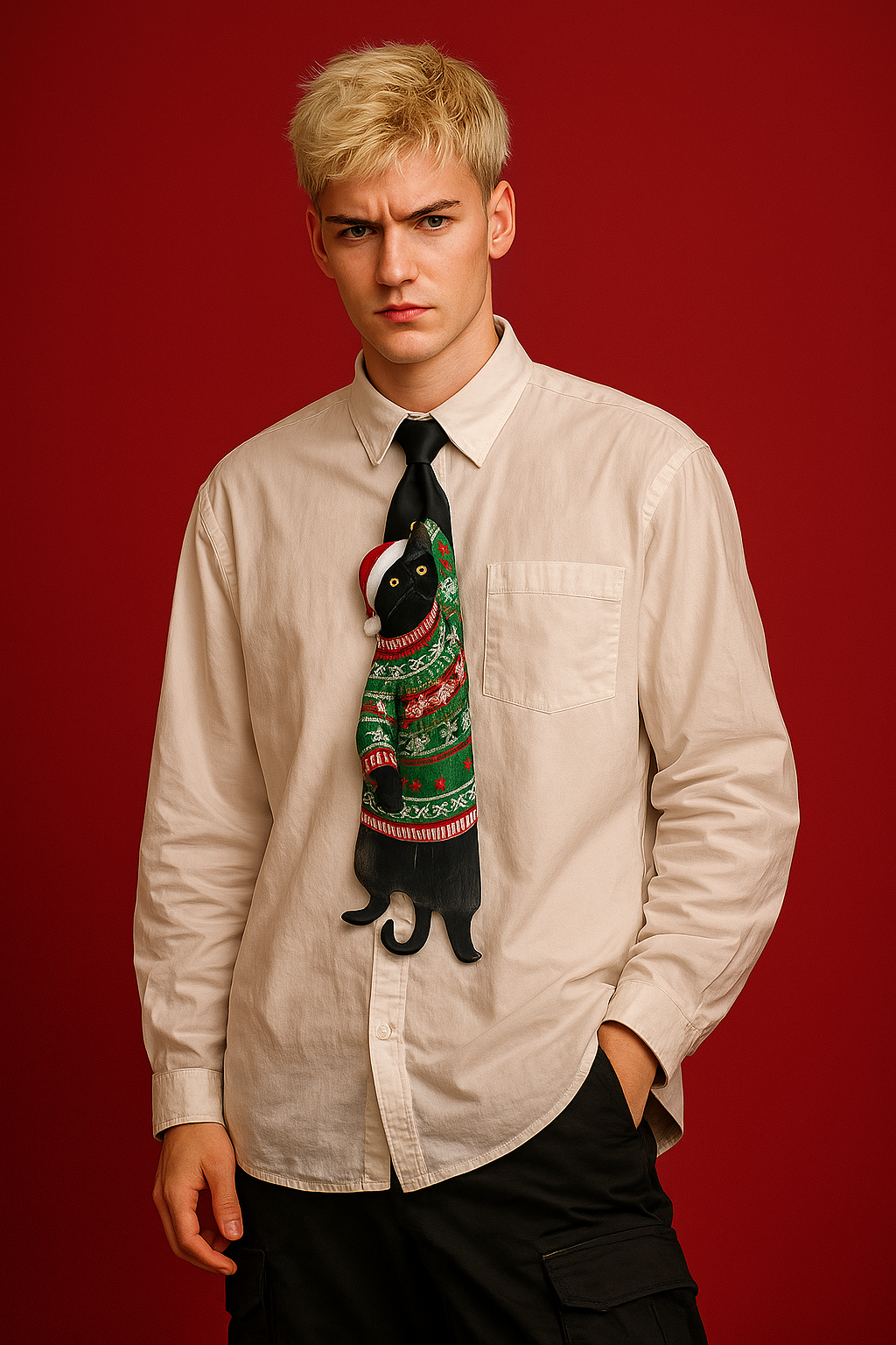 Christmas Novelty Noel Cat - Shaped Tie – Noel Cat Design In Taffeta Silk – Funny Gift for Men – Tie Accessories (Copy) (Copy)